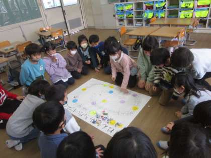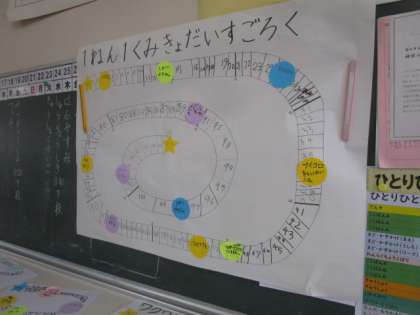 【1年生】きょだいすごろく作り! 公開日 2021/03/08 更新日 2021/03/08 1年生 生活科の昔遊びの学習で『1年1くみきょだいすごろく』を作りました。ペアごとにそれぞれ担当する部分を決めて全員で協力して作りました。全員で遊ぶとどうしても隣の人との距離が近くなってしまいその都度「離れましょう」と声を掛け合って遊ぶ姿が見られました。