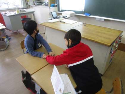 算数の新しい勉強で色板を使って様々な形をつくる『かたちづくり』の学習を行いました。教科書にある問題の他に自分たちで形を考えてお友達に問題を出しました。