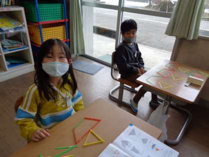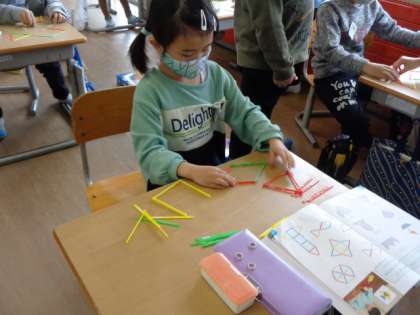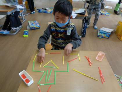 今日は数え棒を使っていろんな形を作りました。初めは戸惑っていましたが、どんどん慣れて、上手に作れるようになってきました。