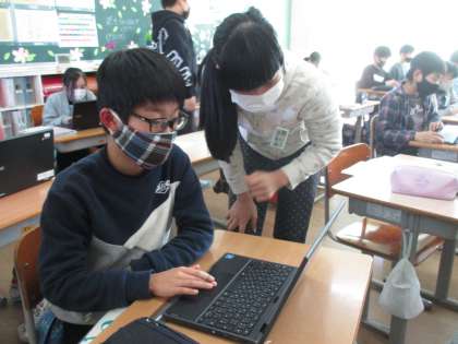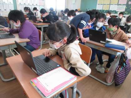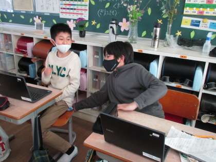国語科の学習でchromebookを使うときも教え合う姿がよく見られます。お互いに助け、がんばっています。