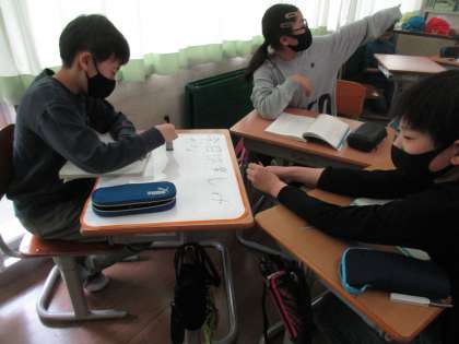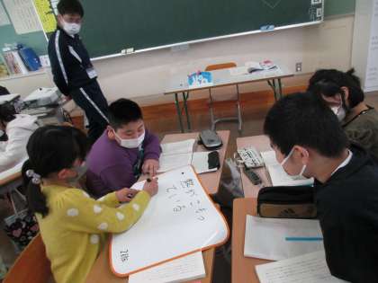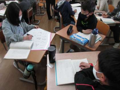大造じいさんとガンの学習。情景描写から大造じいさんの気持ちを読み取りました。グループで意見を合わせることで、全員がよく考えていたと感じます。主題についても、この物語を通して作者が何を伝えようとしていたか、真剣に考えていました。感じ取ったことを、実生活にも生かしてほしいです。