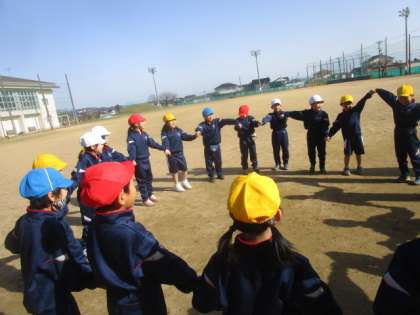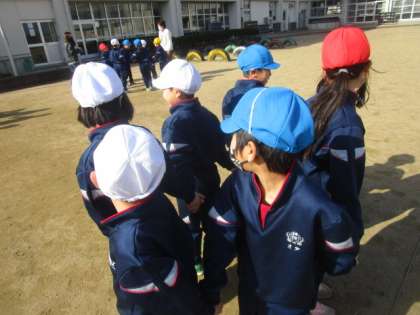 最後の体育はみんなで『なべなべそこぬけ』をしました。最初は2人組から練習し、最後は1年生全員で大きな輪をつくり行いました。手を離さずにきれいにできたときは、おもわず子供たちから大きな歓声が上がりました。
