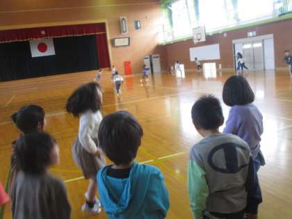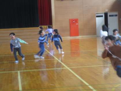 体育館ではケイドロを行いました。警察の人は、係の人が作った警察バッチを胸につけて泥棒を捕まえました。3回捕まったら一生牢獄で復活できないという特別ルールで行いました。