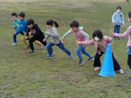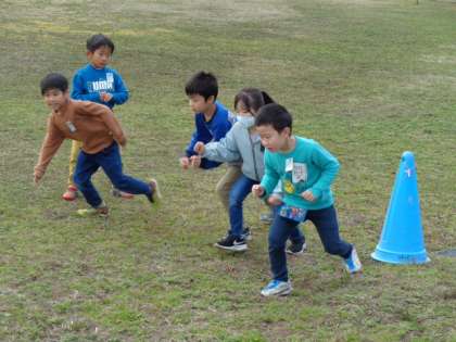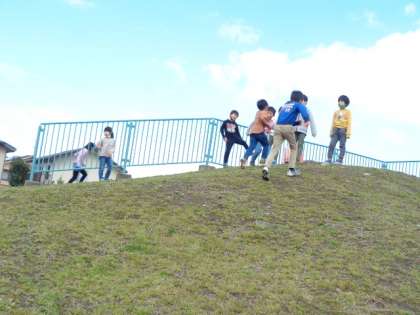 山登り競争です。築山の周りを一周し、その場ジャンプ5回をしたら、頂上までダッシュです。みんなすごい速さでした。