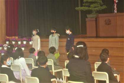 【6年生】お祝いの言葉 公開日 2021/04/07 更新日 2021/04/07 6年生 在校生代表として、3名が入学式でお祝いの言葉を述べました。春休み中にお願いしましたが、全員家庭で一生懸命練習したのでしょう。言葉を暗記し、気持ちを込めて読んでいました。すばらしかったです。 代表の言葉の通り、新入生の皆さんは神保小学校の大切な仲間です。みんなで一緒に楽しく、仲良く学んでいきましょう。