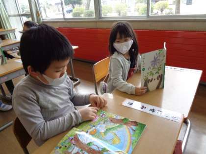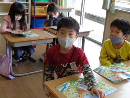 絵を見て、見付けたことを伝え合う学習をしています。今日は初めてペアになって、お互いにクイズを出し合いました。楽しかったですね。