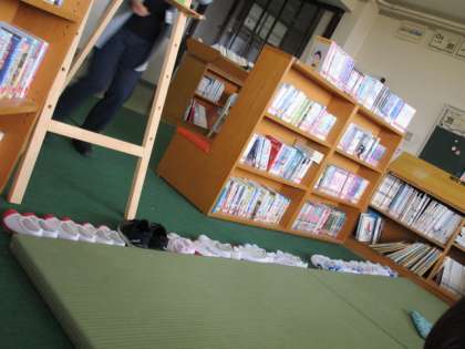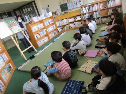 【1年生】はじめての図書室2 公開日 2021/04/13 更新日 2021/04/13 1年生 図書室利用の光景です。大きな絵本を読んでいただき、集中して物語の世界に入っていました。 くつを綺麗に自分から並べていました。すてきですね。