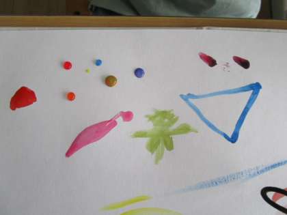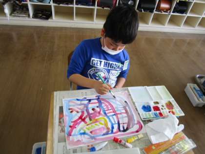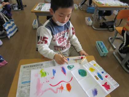 【3年生】絵の具で、いい感じ! 公開日 2021/04/13 更新日 2021/04/13 3年生 赤、青、黄の3色の絵の具だけを使って、絵の具をまぜたり、水の量を変えたりしながら、いろいろな線を引いて、「いい感じ」になるように作品を仕上げました。線を引くうちに、「鯨に見えてきた!」などど想像を膨らませながら、自分の世界に入りこんでいました。