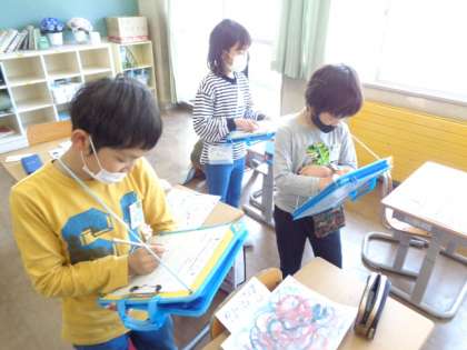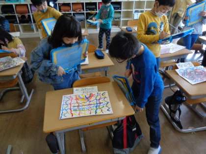 図画工作科「えのぐ+水+ふで=いいかんじ」では、水や絵の具を混ぜて、筆の使い方を楽しんで作品を仕上げました。今日は友達の作品のすてきなところを見つけました。