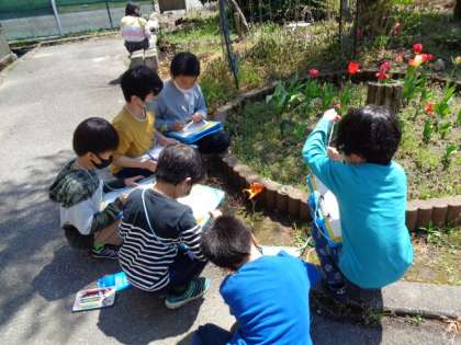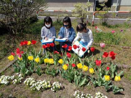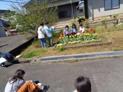 今日は春を探しに外に出ました。花を見つけた子供たちは、花の数や葉っぱのさわり心地などを確かめました。