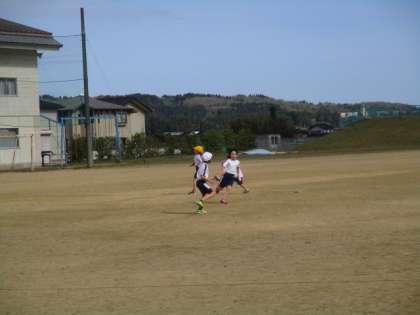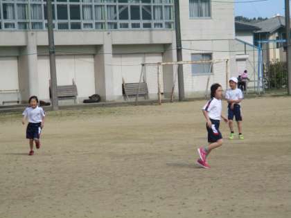 体育では、ABCおにごっこをしました。Aの人はBの人を追いかけ、Bの人はCの人を追いかけ、Cの人はAの人を追いかけました。全員が追いかけ、追いかけられることでたくさん走りました。リレーでは、バトンパス練習をしました。はいとかけ声をかけてから手を出す練習をしました。