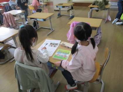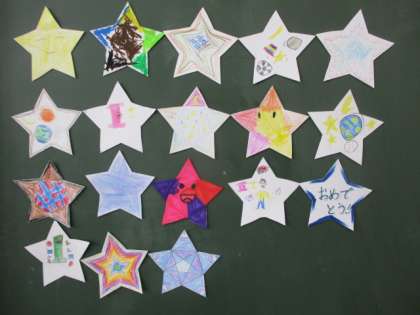学活の時間にお星様作りと係活動・運動会のスローガンに入れたい言葉について話し合いました。係活動では、それぞれの係に分かれてギャグやなぞなぞを考えたり、図書室に参考になる本を借りに行ったりしていました。お星様作りでは、すてきなお星様がたくさんできあがりました。