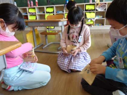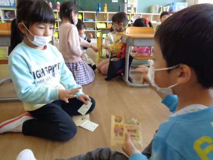 国語の時間に、挨拶をして自己紹介カードを交換しました。友達のカードが集まって子供たちは楽しそうでした。