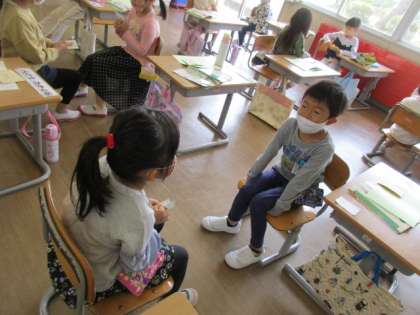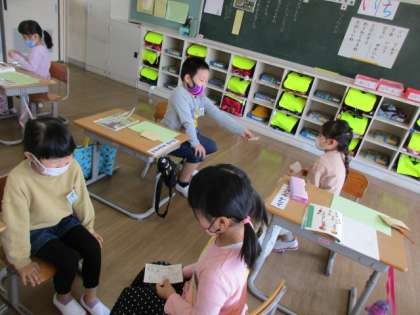 【1年生】どうぞよろしく 公開日 2021/04/21 更新日 2021/04/21 1年生 国語の学習の様子です。昨日作った名刺を自己紹介をしながら交換しました。ふりかえりでは「明日はもっとたくさんの人と自己紹介したい」と意気込む様子が見られました。