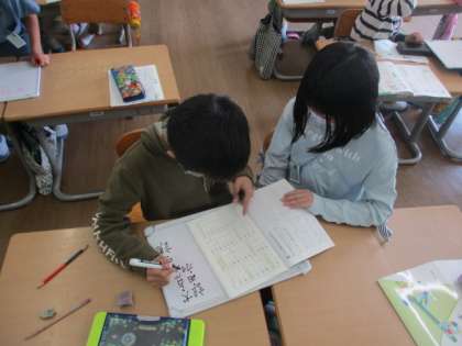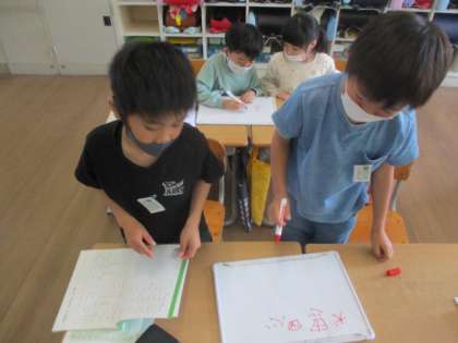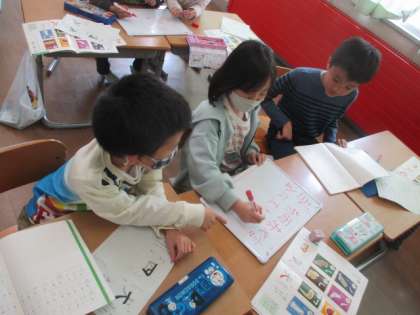 学習の最後には「今まで習った漢字から『おれ』がある字を書けるだけ書こう」と、ホワイトボードと用いてゲームをしました。ペアの友達と協力しながらお題に沿った字を見つけることで、子供達の漢字への関心が益々高まったと思います。