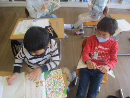 国語科では、遊園地内のイラストを見て、ペアの友達が選んだのはどの人か、見つけ合う活動をしました。