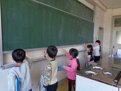 今日から1年生は学校探検をスタートしました。今日は1階の探検をしました。教室とは違う設備をたくさん発見することができました。写真は、家庭科室の動く黒板を試してみる子供たちの様子です。探検を通して学校のことをよりよく知り、どんどん愛着をもってほしいと願っています。