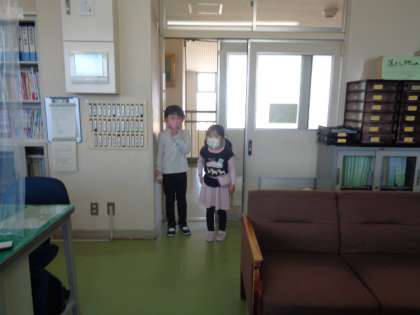 【1年生】一人一役 公開日 2021/04/26 更新日 2021/04/26 1年生 健康観察板とおたよりプリントを職員室に取りにくる係の1年生です。入る前に、大きな声で挨拶をすることができました。職員室の職員も、1年生の頑張っている様子を笑顔で見守っています。