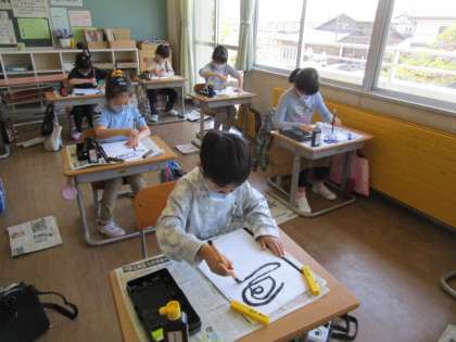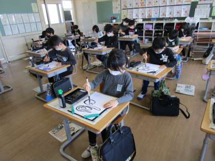 姿勢や筆の持ち方を学習した後、いよいよ墨を入れて書きました。ほどよい緊張感をもちながら、集中して筆の感触を確かめました。