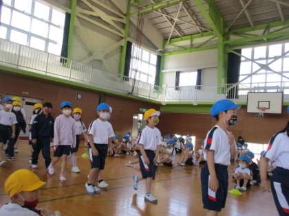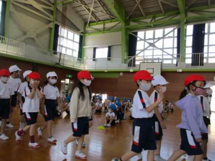 【1年生】入学を祝う会 公開日 2021/04/27 更新日 2021/04/27 1年生 祝う会の様子です。「さんぽ」の音楽に合わせながら、少し緊張しながら入場しました!全校のみんなに拍手で迎えてもらいとても嬉しそうでした。