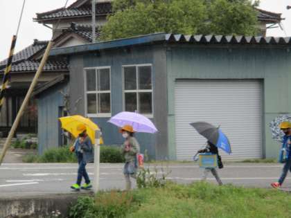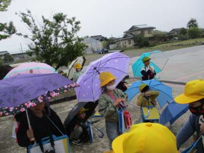 生活科の学習で、神保のすてきを発見するために町探検に行きました。神保小学校を出発したときはまだ晴れていましたが、途中から雨が降ってきました。雨の中傘やカッパを準備して一生懸命目的地を目指して歩きました。