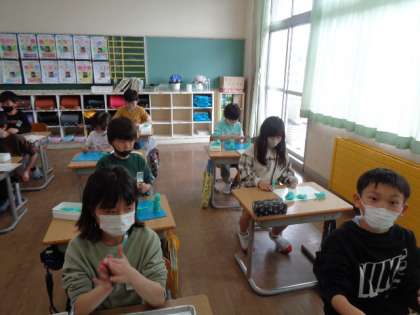 自分だけの住みたい町を粘土で作りました。温泉や遊園地を作り、子供たちは自分の町を楽しく表現していました。