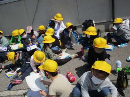 生活科の学習で水曜日に引き続き町探検に出かけました。今日は、学校の南側の千里や小倉方面を散策しました。学校を出発し神保駐在所、千里駅、千里郵便局、ヘアーサロンHoo、千里ショップ、蛍がいる川、ゴリラ公園に行きました。千里駅ではちょうど電車が来て電車を見ることもできました。