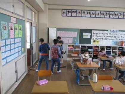 4−1では、登校してから朝の会が始まる時間に何をするか自分で決めて活動しています。みんなのために廊下や教室を掃除する子供、クラスの当番活動を行う子供、自分を高めるために読書をする子供等、それぞれが自分で考えた活動をしています。