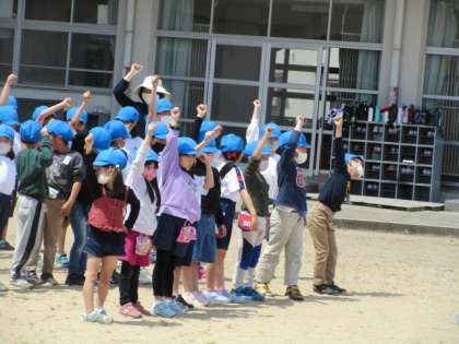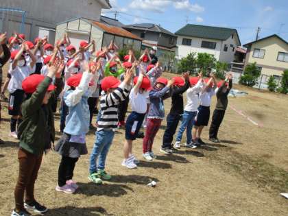 応援練習の様子です。張り切って声をだしたり手拍子をしたりしています。初めての運動会、応援合戦も精一杯頑張ります!