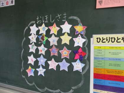 【2年生】お星様いっぱい 公開日 2021/05/11 更新日 2021/05/11 2年生 4月から貯めていたお星様がいっぱいになりました。2年2組にちなんで子供たちは、22個のお星様を貯めることを目標にベル着や、一人一役の活動に取り組んできました。また、みんなでご褒美集会について話し合いましょう!