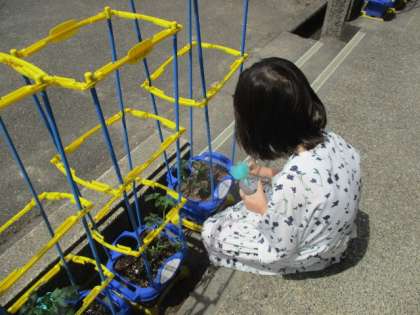 昨日植えたミニトマトと野菜の水やりを朝の活動の時間にしました。これから毎朝水やりが必要で大変ですが、友達と声を掛け合って頑張っていきましょう!