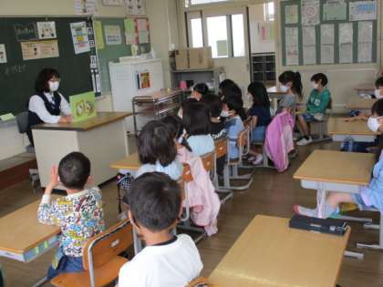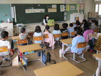読書ボランティアの方による朝の読み聞かせがありました。カエルが主人公の紙芝居を読んでいただきました。
