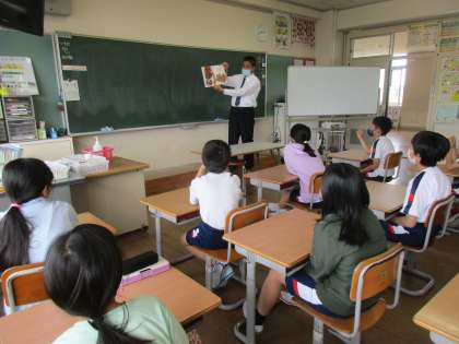 今日の読み聞かせは、校長先生でした。 子供たちは、校長先生のお話にじっと聴き入っていました。