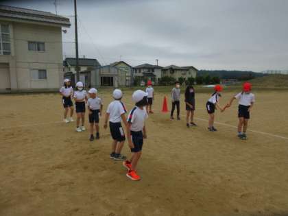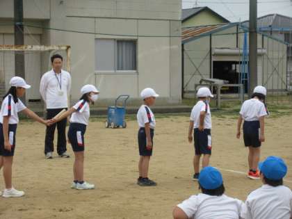 バトンパス練習をしています。色団ごとに声をかけ合い、スムーズに渡せるように頑張っています。