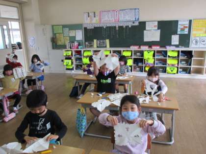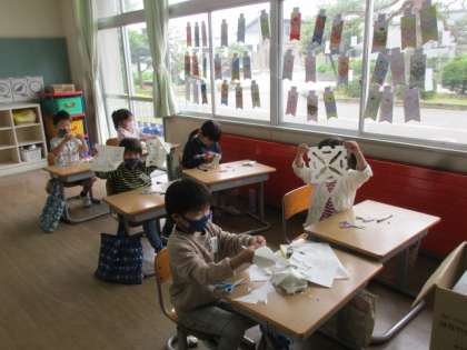 【1年生】ちょきちょきかざり 公開日 2021/05/20 更新日 2021/05/20 1年生 図工「ちょきちょきかざり」の様子です。はさみを使ってかみをきったり、たくさんの模様を作り出すことができました。