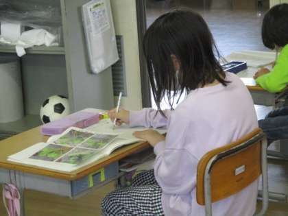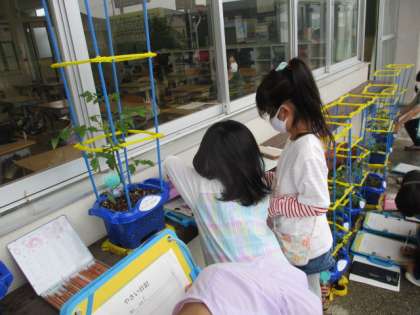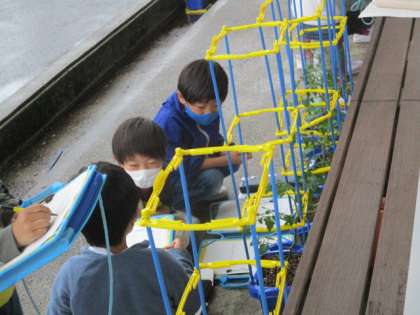 生活科の学習で野菜の観察をしました。畑の野菜は休み時間に畑に行き、写真に納めてそれを見ながら、観察日記を書きました。