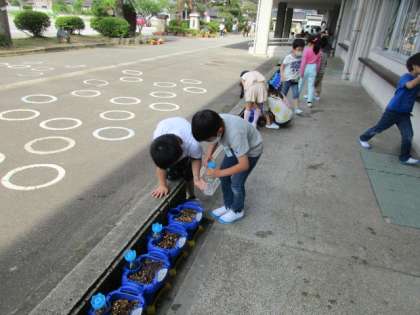 今朝登校すると、少しずつあさがおの芽が出始めていました。あさがおの成長を楽しみにしています。