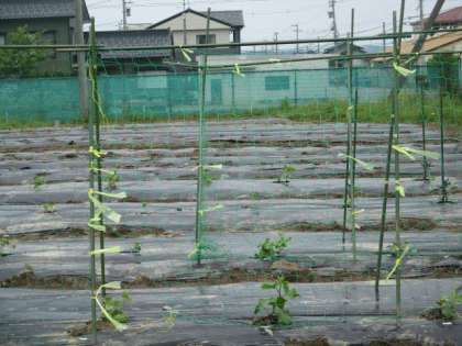 支柱にみんなで協力してネットをかけました。美味しい野菜が収穫できるようにお世話を頑張っていきましょう!