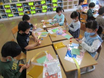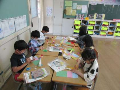 【1年生】ちょきちょきかざり 公開日 2021/05/27 更新日 2021/05/27 1年生 図工の様子です。先週練習したちょきちょきかざりの本番をしました。きれいな色紙を重ねたり、好きな順番に連ねたりして、とっておきのかざりが完成しました。