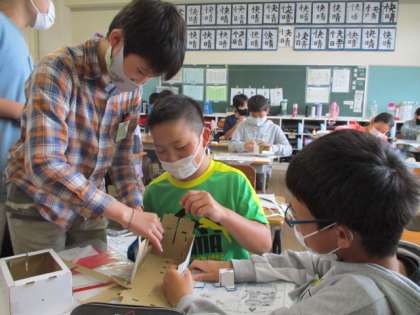 【6年生】くるくるクランク 公開日 2021/05/27 更新日 2021/05/27 6年生 図工の学習。クランクを生かした作品を作っていきます。今日は本体の組立てが中心だったため、教え合う姿も多く見られました。次週、作品に色紙や画用紙等で飾り付けていきます。