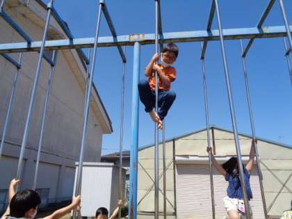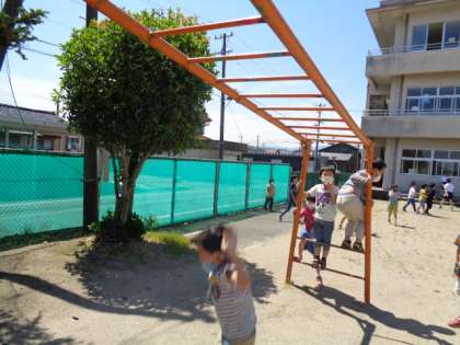 爽やかないい天気でした。雲梯や登り棒で遊びました。経験を積むほど上手になります。どんどん楽しく遊んでほしいです。