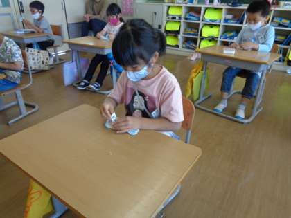 今日からたしざん計算カードを始めました。今日は一人でするやり方と、友達とカードを使ったゲームをしました。見た瞬間に答えが出るようになるよう、学校でも家でも習熟を図っていきたいと思います。