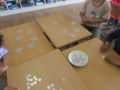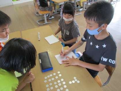 数えてみよう(算数) 公開日 2021/06/02 更新日 2021/06/02 2年生 今日の算数は、たくさんの1円玉を数えようという学習でした。1枚ずつお皿に入れながら数えるグループや10のまとまりをつくるグループ、4人で分担して最後に筆算するグループなど、いろいろな数え方を紹介し合いました。3桁の繰り上がりは習っていないのに、必死に計算する姿に子供たちの追究力のすごさを見た1時間でした。