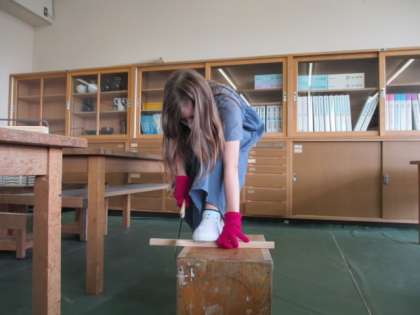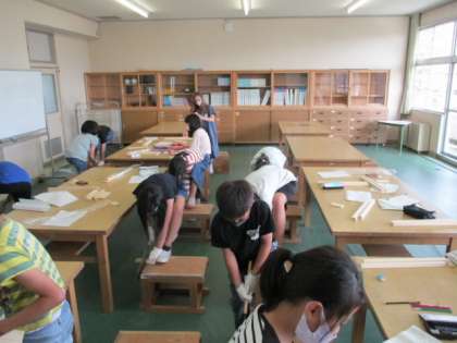 4年生の子供たちは、図画工作科の学習で、のこぎりや金づちを使って作品づくりに取り組んでいます。最初にのこぎりの使い方を学習した後、さっそく角材を切ってみました。初めてのこぎりを使う子供も多いので、最初はうまくいかずに困っている子供もいましたが、徐々に慣れ、スムーズに切れるようになってきました。これからも、それぞれ工夫しながら作品作りを進めていきます。