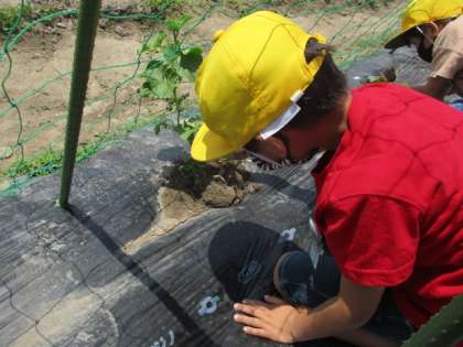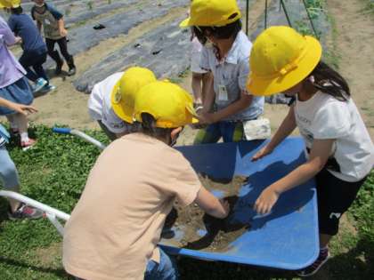 生活科の学習で、野菜のお世話をしました。今日は畑の草むしりと根っこが見えている人が何人かいたので土をかけました。