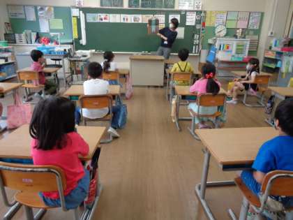 教頭先生に「ろくべえまってろよ」を読み聞かせしていただきました。子供たちは真剣に聴き入っていました。