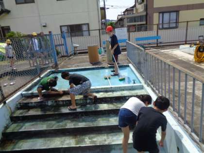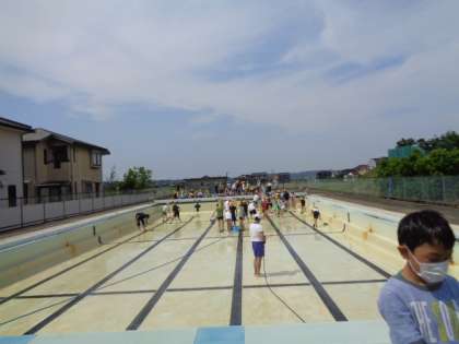 【5年生】プール清掃1 公開日 2021/06/07 更新日 2021/06/07 5年生 6年生と一緒にプール清掃をしました。2年ぶりの清掃ということもあり、汚れや泥がたくさんありました。プールやシャワーの汚れを丁寧に掃除していました。全校のために仕事を進んで取り組む姿が素敵でした。高学年らしさが見えたプール清掃でした。