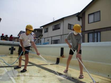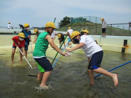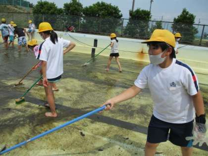 プール清掃を行いました。最初は写真の通り、とても汚れていたのが分かります。2年分の汚れに子供たちも驚いていましたが、あきらめずによく頑張っていました。