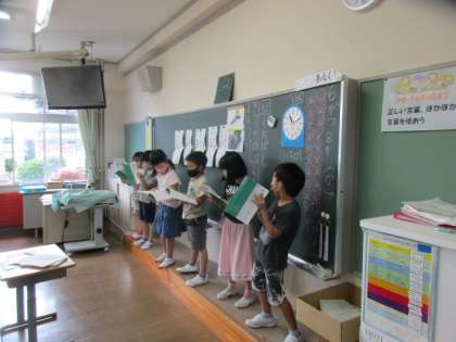 【1年生】くちばしの音読 公開日 2021/06/08 更新日 2021/06/08 1年生 毎日宿題や授業で「くちばし」の音読を頑張っている子供たちです。列ごとに前へ出てみんなの前で音読しました。昨日より自信をもってすらすら読めている様子でした。地道に練習を重ねていきたいと思います。
