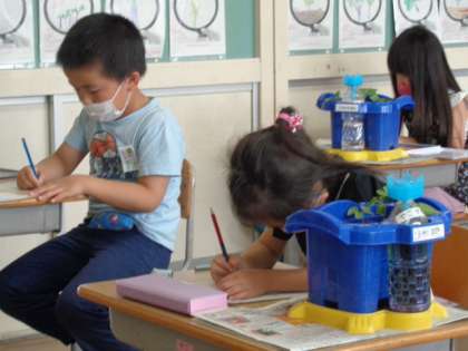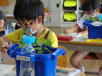 芽を出した朝顔が元気に生長しています。子供たちは細かいところまでよく観察して違いに気付いていました。